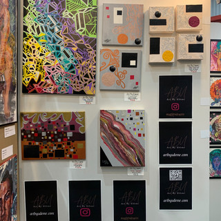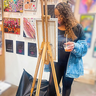 On the day of the event I arrived at the location a couple of hours ahead to set up. I pull up to a place I’ve never been before. The “Stanely Market Place”, a brand new structure in the city I know so well. It was a pleasant surprise! Such a cute place with all the restaurants and little shops. As I entered I was approached by a beautiful hostess from a restaurant. The hostess offered to walk me down to where the art show was being set up. She was so happy to see the local artists arriving to set up for the show. Her good energy helped me shake off the nerves and a bonus! I did get a little lost finding my way down the hall she directed me to. Once I found the entrance I was greeted by a pleasant and professional young man. All I could think was “Alright, I made it. The vibes are feeling good and I feel comfortable.” The setup was much easier than anticipated, thank goodness.